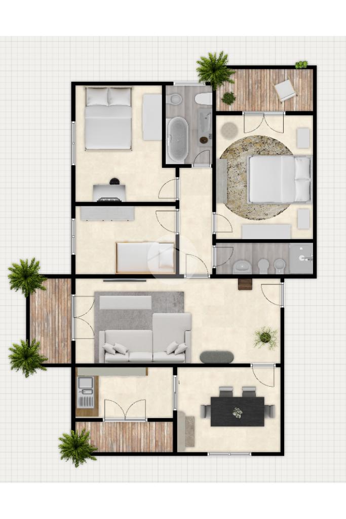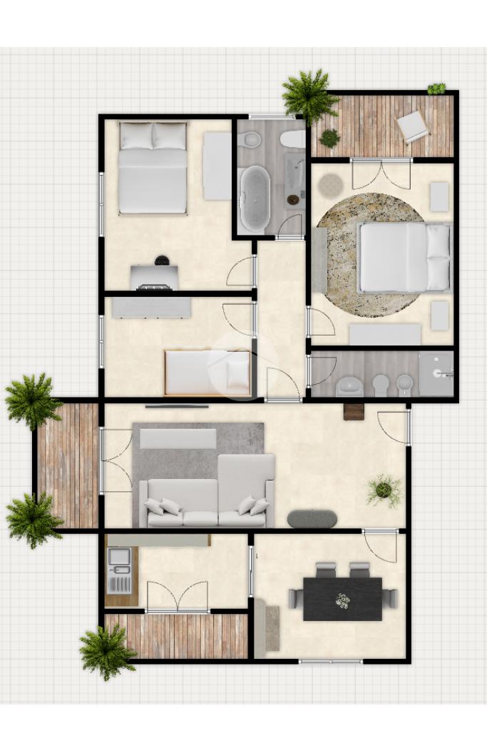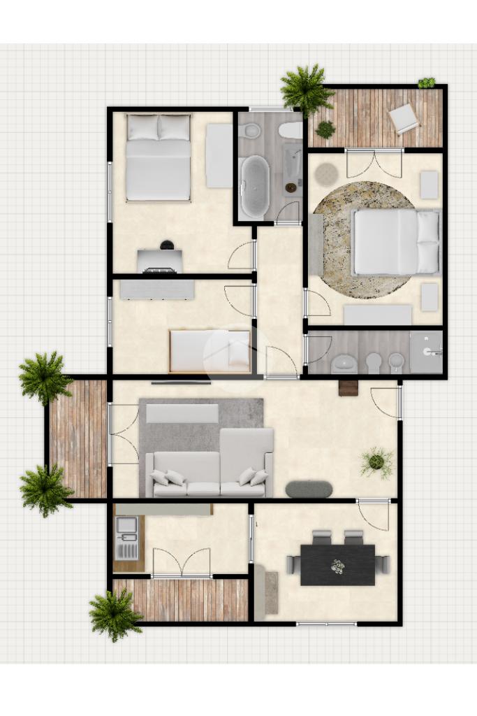 La zona notte è composta da due camere matrimoniali, perfette per chi vuole comfort e privacy, affiancate da una cameretta/studio che aggiunge versatilità: può diventare l’ufficio ideale per lo smart working, una stanza per gli ospiti o uno spazio dedicato ai propri hobby. I due bagni, di cui uno finestrato, rendono la gestione quotidiana fluida e funzionale, un dettaglio che fa davvero la differenza nella qualità della vita domestica.