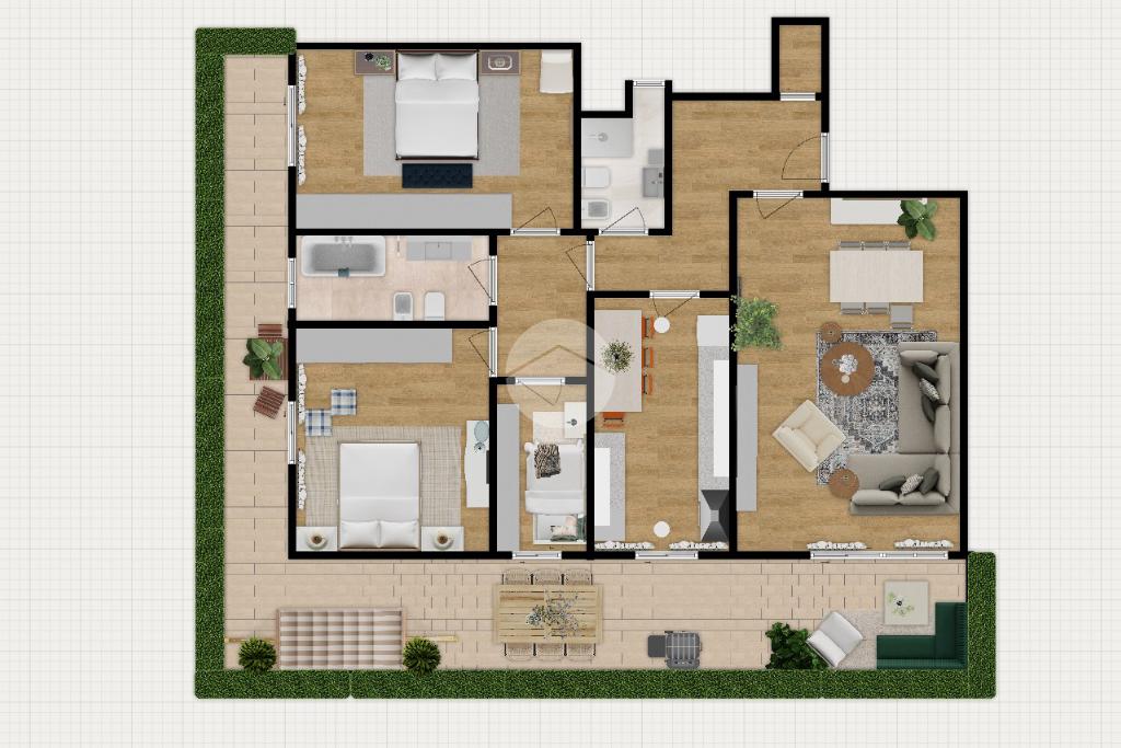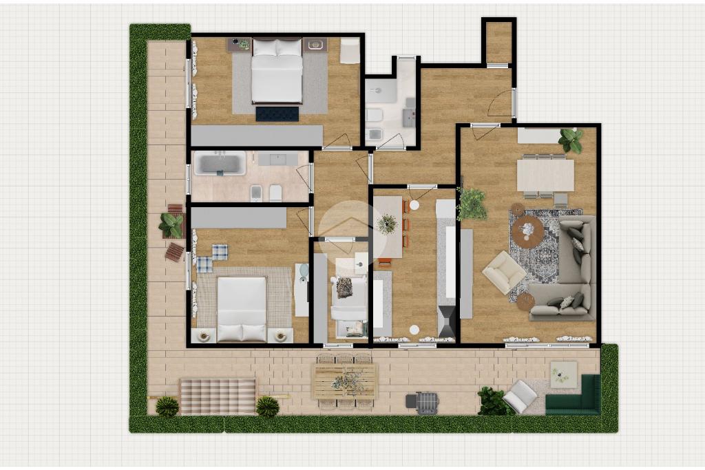 Lo spazio esterno accompagna più lati dell’appartamento e si inserisce in modo naturale nella casa, diventando un valore aggiunto discreto ma presente, perfetto per ampliare la vivibilità degli ambienti interni.
